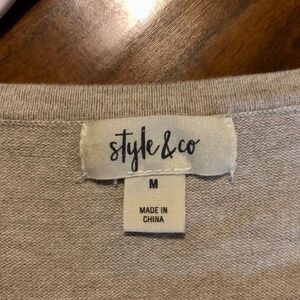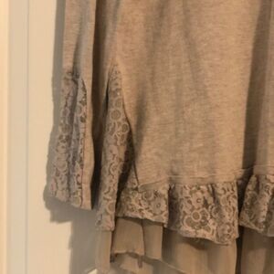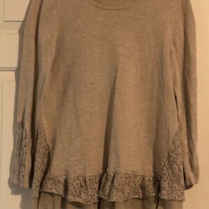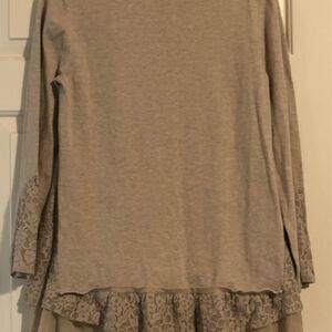 Long sleeved medium shirt with a lace design on the sleeves and bottom of the shirt. The bottom also has a sheer layer. In excellent, pre-loved condition. Comes from a non-smoking home.