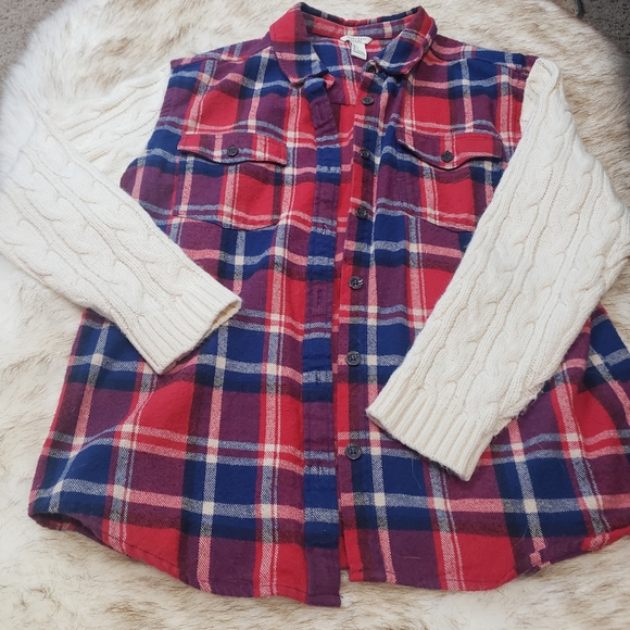 Super cute flannel/plaid shirt with knit sweater arms size L but it would fit normal like a M.