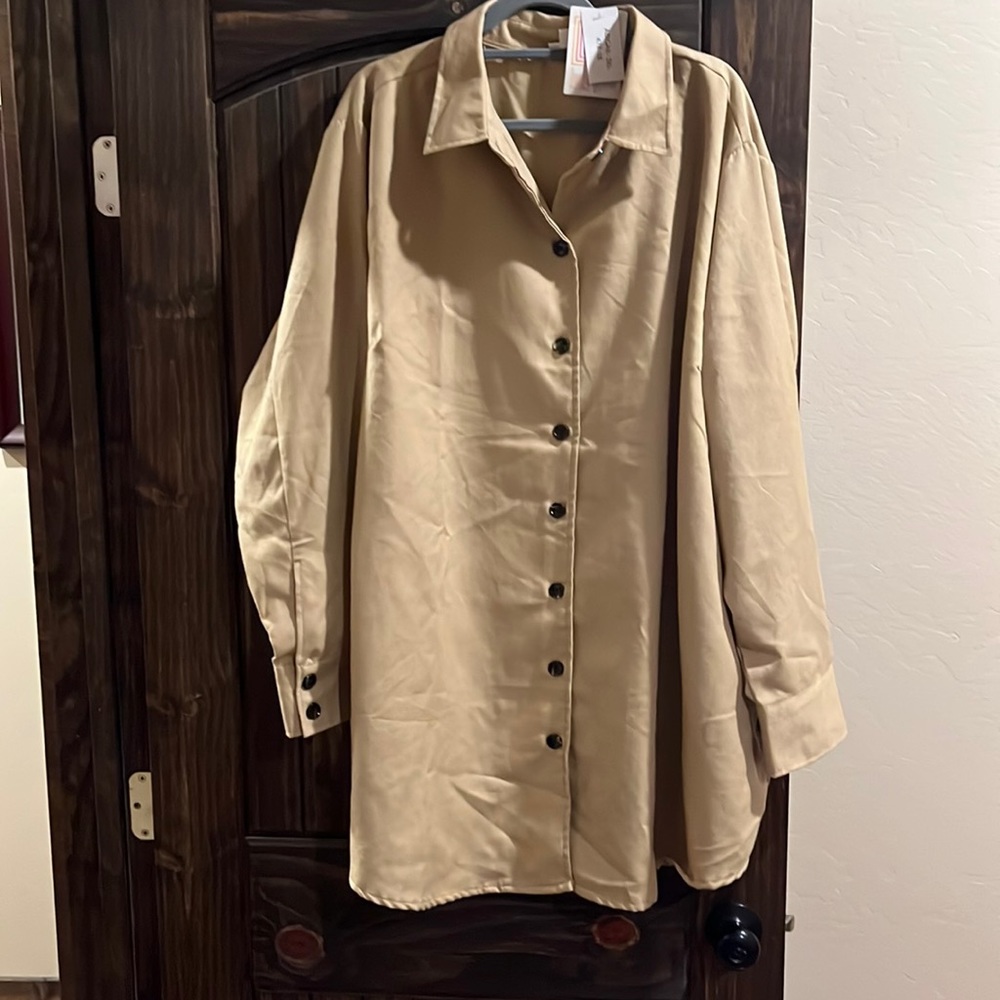 Long shacket with pockets, it’s like a creamy tan/beige more yellow tones