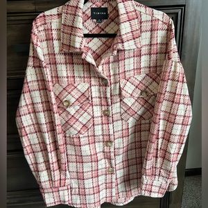Timing flannel Shacket NWOT. Tag says medium but it is oversized.. I think it can fit a L/XL too! It is cream, pink, and burgundy with tortoise shell buttons. Not lined but lightweight and super cute!!!