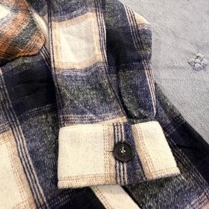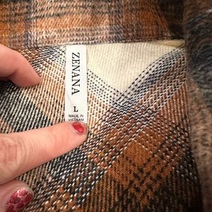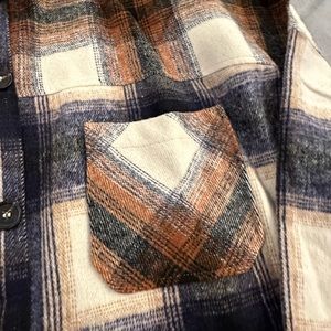 Plaid pattern in browns and cream colors, front functional chest pocket, button front