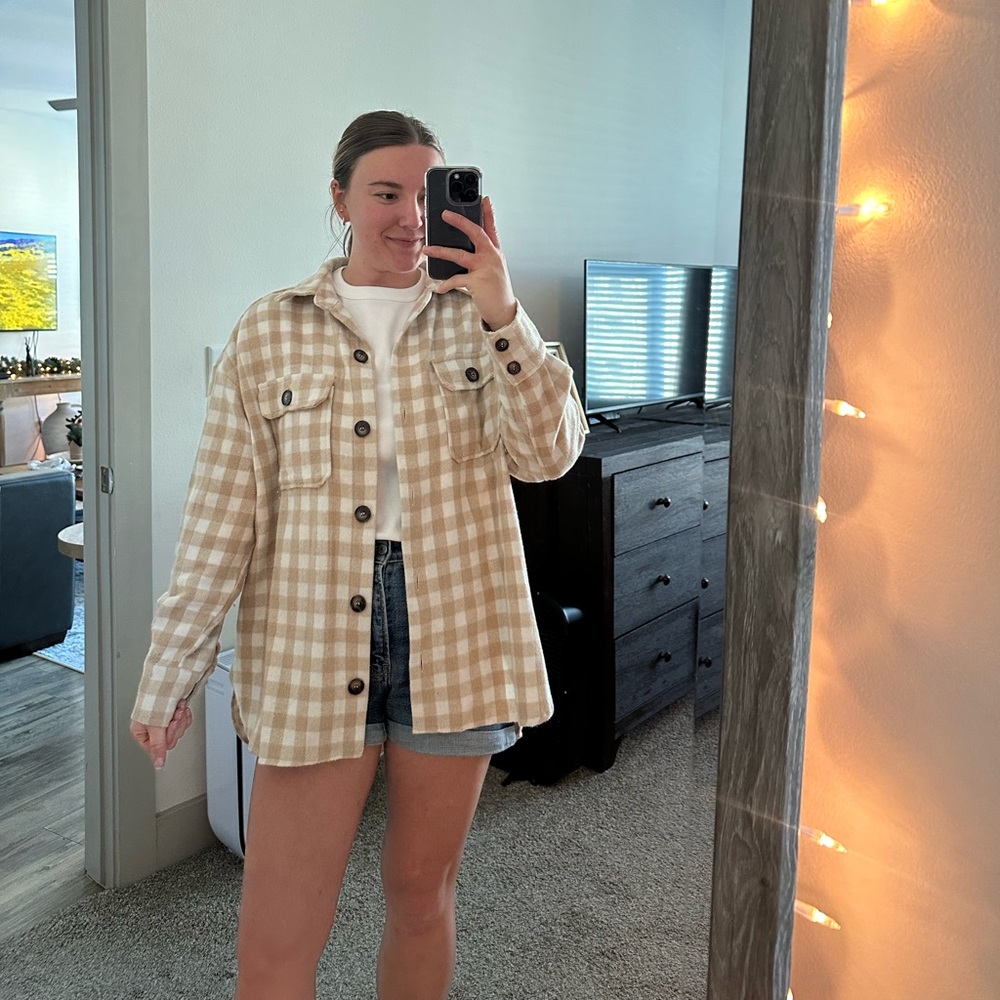Tan and white shacket! Perfect for throwing over a long-sleeve shirt. Not itchy. Fits oversized. I’m TTS medium, but wearing a small in this. Worn once. Originally paid $78 for it at a local boutique.