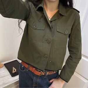 Army green shacket, this does not have any size tags as I believe they were cut off. I’m a small and would say this would fit someone who is XS/S well.