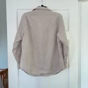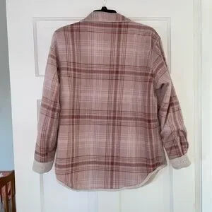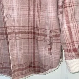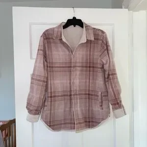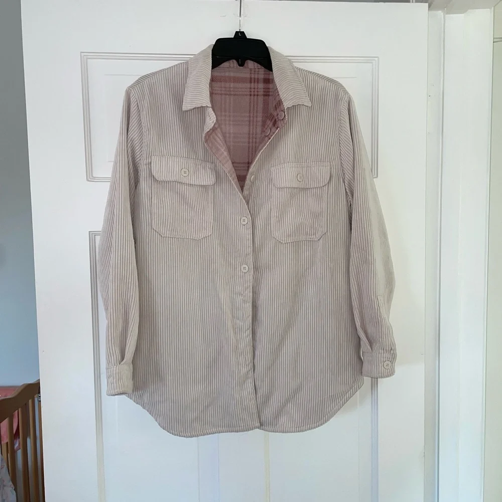 Women’s button up shacket - reversible. One way is pink plaid flannel with pockets and the other is a cream colored soft corduroy material. Fits like a medium