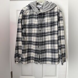 Size medium Urban Outfitters black and white plaid shacket with a grey hood. Material is 100% cotton.
