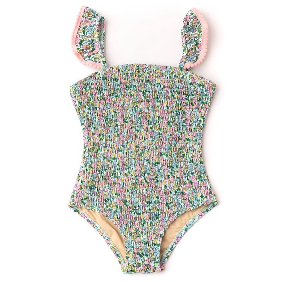 Bright and fun kids swimwear perfect for summer adventures. Features a vibrant multicolor design with a smocked design. UPF 50+ material.
