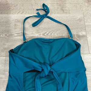 Shade & Shore Bandeau / Halter Tie Back One Piece Swimsuit Teal in size M. Excellent like new condition. Shelf bra with removable pads, can be worn with halter straps or strapless, open cutout in back. Please see photos for approximate measurements and details. Item may show a difference in color based upon photography and perception. Photos are part of the description, as everyone’s level of condition may vary. From smoke free and pet free home. All packages are shipped the same or next business day.