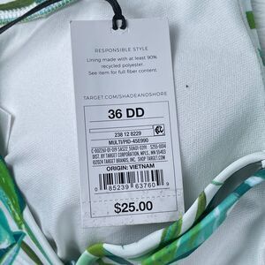Embrace the sun with the Shade & Shore Bikini Top, a chic addition to your swimwear collection. Designed for a perfect fit, this women's size 36DD top offers both comfort and style with its lush green leaf print. The wide strap design ensures ample support while the removable padded cups allow for customizable coverage. Crafted from smooth polyester, this bikini top is machine washable for easy care. Whether you're planning a tropical getaway or a day at the pool, this non-vintage, floral-themed swim top is a versatile piece that pairs effortlessly with your favorite bikini bottoms.