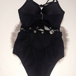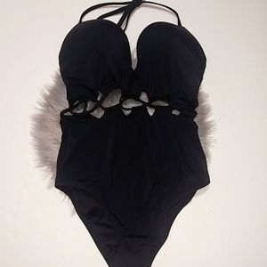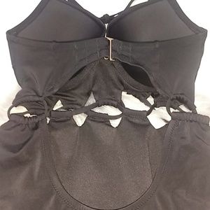 Padded black one piece swimsuit. Small cutouts around the stomach. Big cutout back. Hooks in the back and ties around the neck. Underwire
