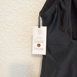 This elegant black one-piece swimsuit by Shade & Shore showcases a high neckline and a flattering waist detail. Its sleek design is crafted for both style and functionality, making it ideal for swimming or relaxing by the water.