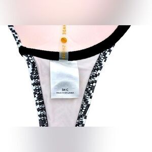 Shade & Shore Black White Geometric Lightly Padded Bra Bikini Swim Top sz 34C. Beautiful geometric pattern with tassel, underwire and lightly padded soft cups. Fabric 67% Polyester 22% Nylon, 11% Spandex. Cup lining: 100% Polyester. Hand wash for best results. Measurements in photos.