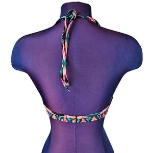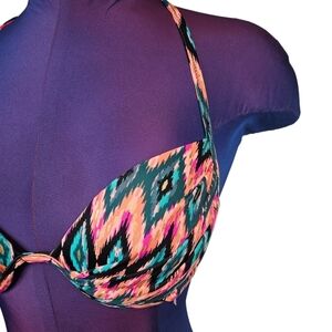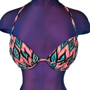 Features multicolor Aztec print bikini top, molded cups, push up with underwire, halter with tie at neck and back hook eye clasp, beachwear, swimsuit, beach, vacation.