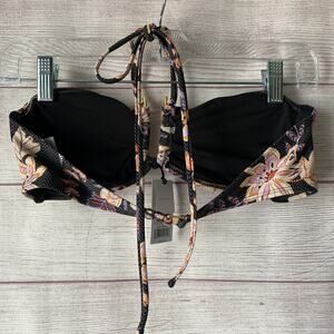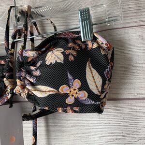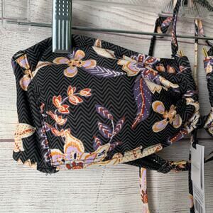 Floral and chevron pattern bandeau bikini top by Shade & Shore. This bikini top has a gold metal "U" in the middle which creates a keyhole in the bandeau top. The pattern is black and grey chevron with a floral pattern of cream, rust red, lavender, and orange layered on top. It has spaghetti strap halter tie strings and a gold G hook on the back strap. It is NEW, with tags.