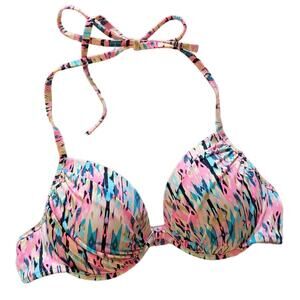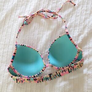 Great bikini top with abstract neon pink, black, teal, gold. Halter tie neck, adjustable chest band, padded and push up.