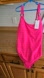 This brand-new, NWT (New With Tags) swimsuit in size Medium offers a vibrant hot pink hue with unique brown loop accent details at the front.