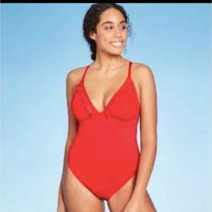 Shade Shore Plunging Neckline Swim Ruffled Strappy Cheeky Bathing Suit Tank L