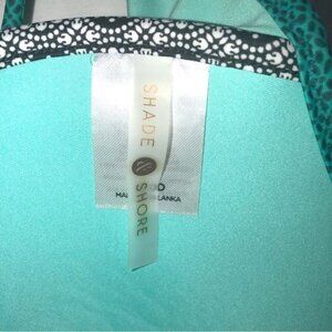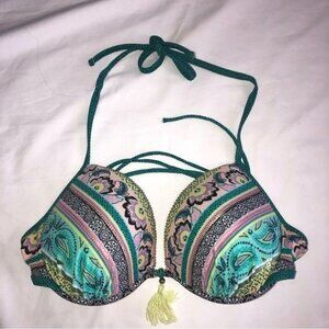 Excellent barely worn condition size 34DD bikini top by Shade & Shore. Color is an aqua type blueish green or greenish blue. Ties at neck and back. Purple yellow blue in print. Trimmed in gold beading with yellow tassel in front. This is top only. This brand sizing is based on bra size.