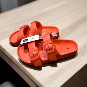 Brighten up your summer style with these bold orange slide sandals from Shade & Shore. Designed with two adjustable buckle straps and a contoured footbed, these lightweight slip-ons are perfect for warm weather, casual wear, and beach outings.