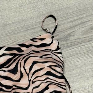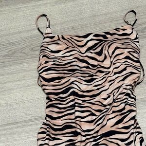 Cut up high on the hips and laces up the back. Stylish zebra print swimsuit with spaghetti straps. Perfect for a bold beach look.