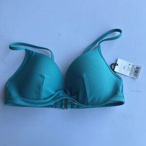 A bright teal color makes for the perfect sunny-day look especially if you choose to pair this bikini top with coordinating bottoms or an equally lively pair. Sewn-in cups provide you with enough coverage for confident wear while adjustable straps let you find your ideal fit. You'll love how the wrap-front silhouette beautifully contours to the figure for a flattering look along with the textured finish that lends a bit of extra definition.