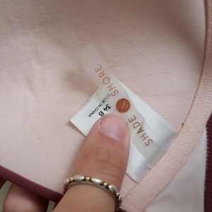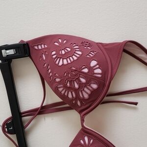 Shade and shore women's bikini top, Lazer cut design, colorway is purply red with pink under color, halter tie, with hook back closure, triangle top, padded, women's 34 B. no flaws.