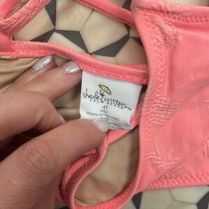 Salmon pink bikini set featuring a subtle pineapple print. Includes a crop top with adjustable staps and high-waisted bottoms. Brand is shade critters sz 4t