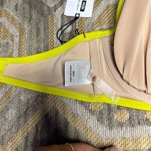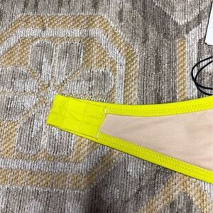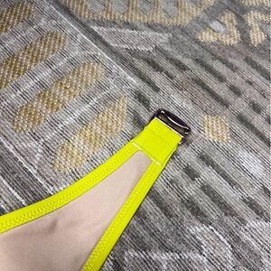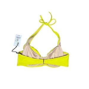 Ruched front. Underwire. Halter straps. Adjustable back hook closure. Neon green color. Removable pads