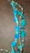 multistrand turquoise color howlite and mother of pearl shell necklace. three strands. silvertone tribal rustic beads and faceted blue glass beads accent this piece. very interesting swirly acrylic sort of pumpkin shaped beads as well. choker collar adjustable length. unmarked. Great preloved condition. please see photos for details and measurements and condition other items are display only