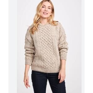 This authentic Irish fisherman sweater by Shades of Aran features a thick cable knit in a soft tan-cream Merino wool. With a chunky texture, long sleeves, and a classic silhouette, it’s a cozy, heritage-inspired staple.