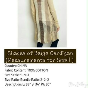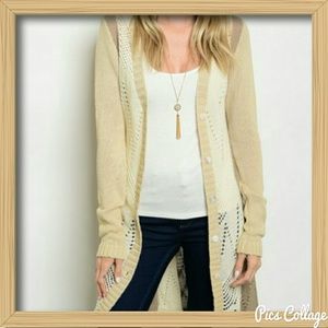 Longer length, open-knit, button down cardigan with shades of beige, cream, & oatmeal. Fits true to size. 100% cotton.