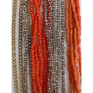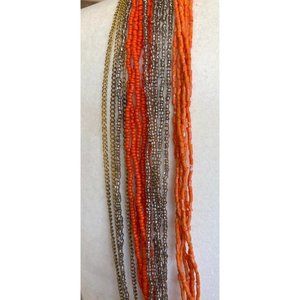Shades of Orange 20 Strand Torsade Statement Necklace. For the collector or vintage, costume wearer, a delight and strands of bright orange melon and orange chains of gold chains of silver and acrylic beads of clear a showstopper. Measurements: Length: 34"; Width: 1.5".