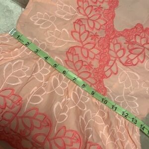 This is a new with tags pink cotton cross over front, embroidered top. This is sleeveless with a fitted waist and a peplum style bottom. There is a snap at the bottom of the V at the chest and it is a pretty secure snap. This is a thin, lightweight top perfect for summer. Photos showing measurements are of the size small. The large is about 20 pit to pit and 15 at the waist. New with tags, never worn.