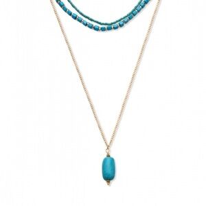 Brand new triple strand necklace that features small turquoise beads in a more green tint and then larger turquoise beads in bluer tint and a gold chain that has a turquoise colored bead on the bottom that is a mix of the two colors on the chains. This extends from 14-16.5 inches So the first layer is almost like a choker and then they get progressively longer from there. Brand new in original packaging comes on a card that is suitable for gifting. Nice mix of bohemian and contemporary design.