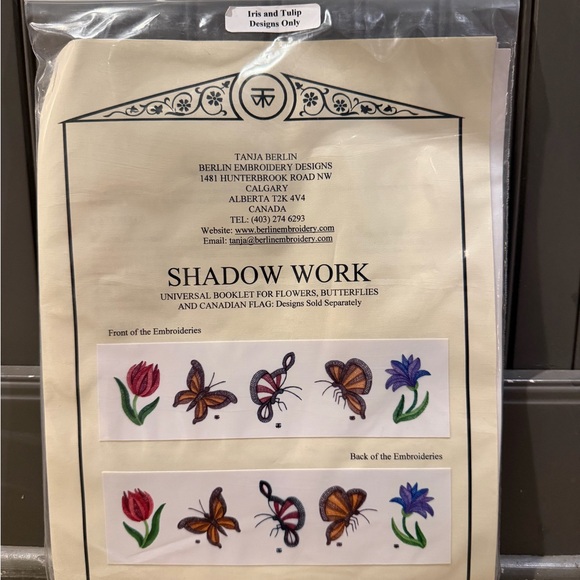 Shadow Work embroidery booklet featuring flowers and butterflies. Includes detailed designs and instructions.