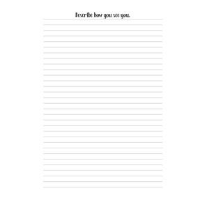 Book is 6x9 and 100 pages featuring more than 40 thought provoking prompts. The prints include many questions from childhood to adulthood to get you digging deep into your darkest self.