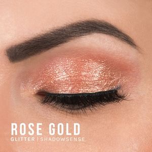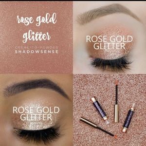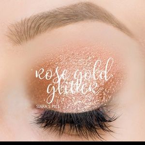 Creme to powder eyeshadow. Rose gold color with gold glitter finish. Lasts all day and wont come off til you're ready for it to come off.