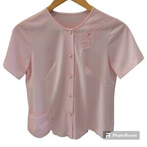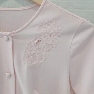 Womens, Shadowline two piece pajama set, in size Petite which is equivalent to modern XS. Vintage from the 1960s. Top is short sleeve, with floral lace detail on chest. Has lace trim around the scallop hem also. Button up design with cloth covered buttons. The pants are capri length with an elastic waist. Made in USA.