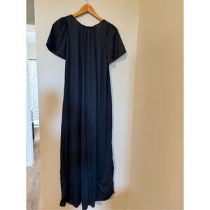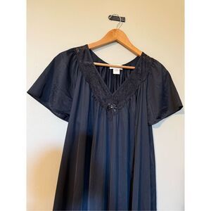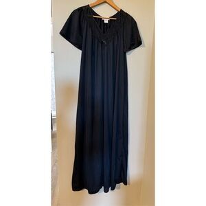 Shadowline Size L Short Sleeve Nightgown Black Satin Floor Length Lace Trim