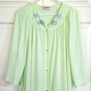 Excellent condition-pale mint seaform green color with blue floral design at neckline on both the robe and the nightshirt. Probably used to be a 3-piece set with pants. Button closures. No noticeable snags or stains. Very lightweight.