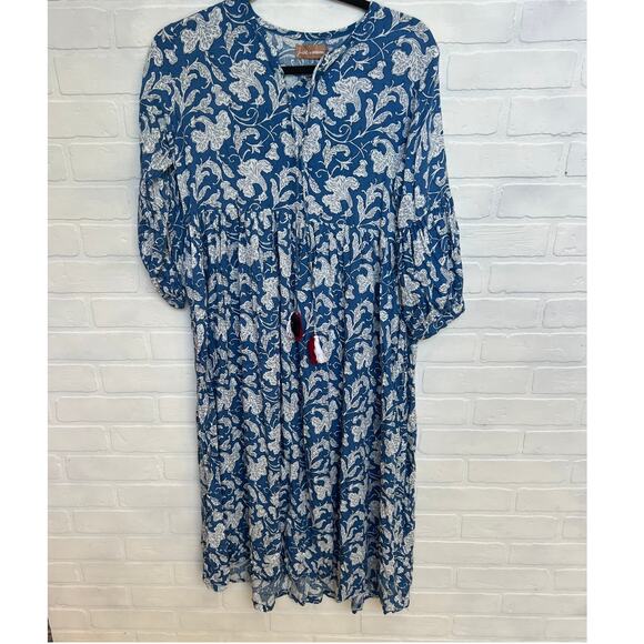 Shae by Sassafras Floral Blue White Flowy 3/4 Sleeves Soft Midi Dress -sz L