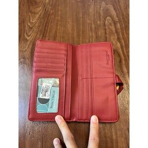 Perfect condition, Still has all internal sale sticker and silica packet. No signs of use or wear. Soft faux leather, Magnetic strap front closure with a back zipper closure pocket space. Red in color