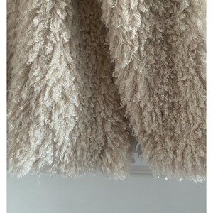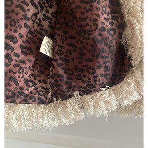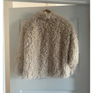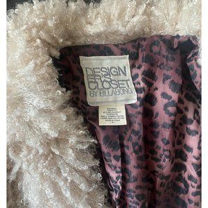 Shaggy faux Fur Billabong jacket, like NEW, size M, in color cream. 21" long. Curly shaggy fur about 1.5" long. Slit pockets. Lining in brown sheetah print. 100% polyester.