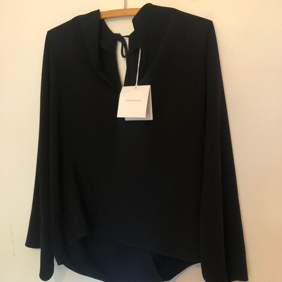 Very classy long sleeve blouse in black tencel twill with draped, twisted back with tie at back neck. V neckline, wide raglan sleeve, fold back deep V collar. Pull on. Unlined. 100% lyocell. Dry clean. Made in USA.