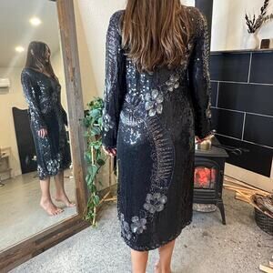 Shajahan Women’s Medium Dress Black Beaded Silk Sequin Formal Midi Gown Floral Long Sleeves Glam Prom NYE Dinner Party Rare Unique
