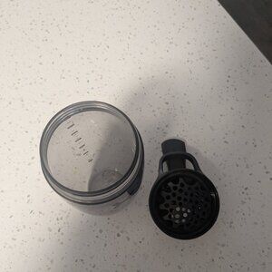 New but no tags - never used. This protein shaker bottle has the blender element attached to the lid so you can blend your protein shakes without the sound of the metal ball most protein shaker bottles have. 24 ounces, clear black plastic.
