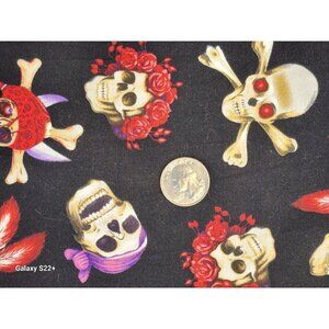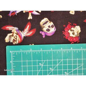 A vibrant cotton fabric featuring skulls, crossbones, roses, and feathers in bold colors on a black background. Ideal for crafting or sewing projects.