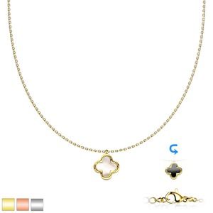 Double Faced Lucky Shamrock Pendant with Shell and Black Enamel filled back Chain Necklace
