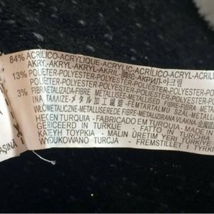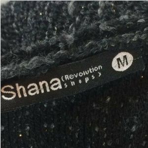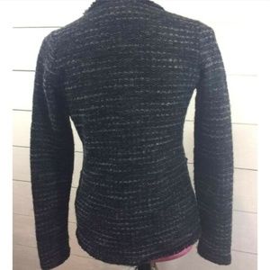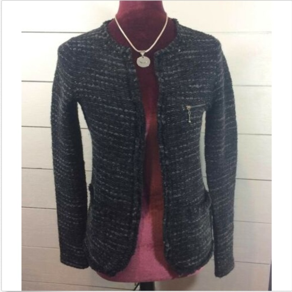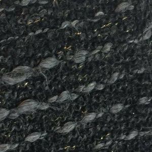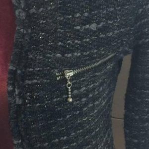 This is a great embellished dark grey sweater with gold fibers woven in. Studded collar, faux zippered pocket and two front pockets with studs.