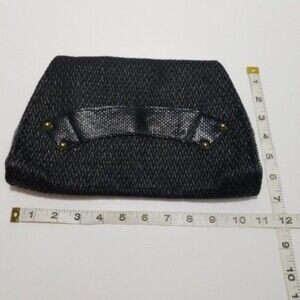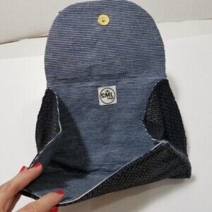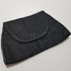 Shana Luther SML bags are hand made in Brooklyn NYC. This one has a black subtle chevron zigzag textured fabric in a trapezoid geometric shape with a hand strap flat across the back side. One main compartment closes with a snap lined in nautical white pinstripes. In excellent, clean condition. It originally had a decorative button on the front that I removed and you can't even tell, I prefer it simple but you can add one of your own. Sophisticated boho chic! See photos for approximate measurements of 10 x 7 inches. Retail was over $200.