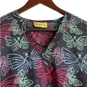 Shana Women Scrub Top L Navy Butterfly Medical Uniform Nurse Workwear Dental